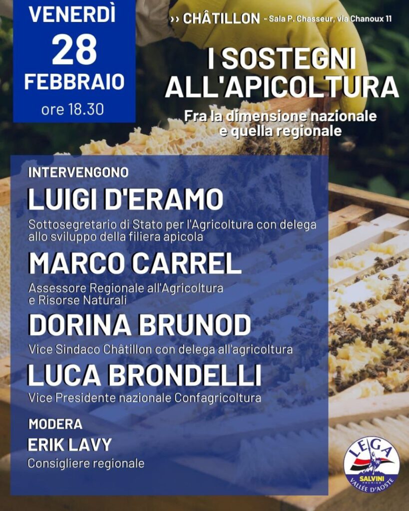 La conferenza, moderata dal Vicecapogruppo del Carroccio in Consiglio Valle Erik Lavy, è aperto a tutti, apicoltori, operatori del settore, ma anche appassionati e curiosi, che potranno dialogare direttamente con i relatori.