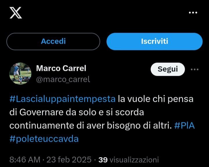 Ma forse più che le pressioni esterne, Testolin dovrebbe tenere sotto controllo il malcontento interno. Infatti, è comparso ieri su ‘X’ un post di Marco Carrel, Assesore regionale all’Agricoltura e volto di punta di Pour l’Autonomie, dal taglio criptico e interpretabile: