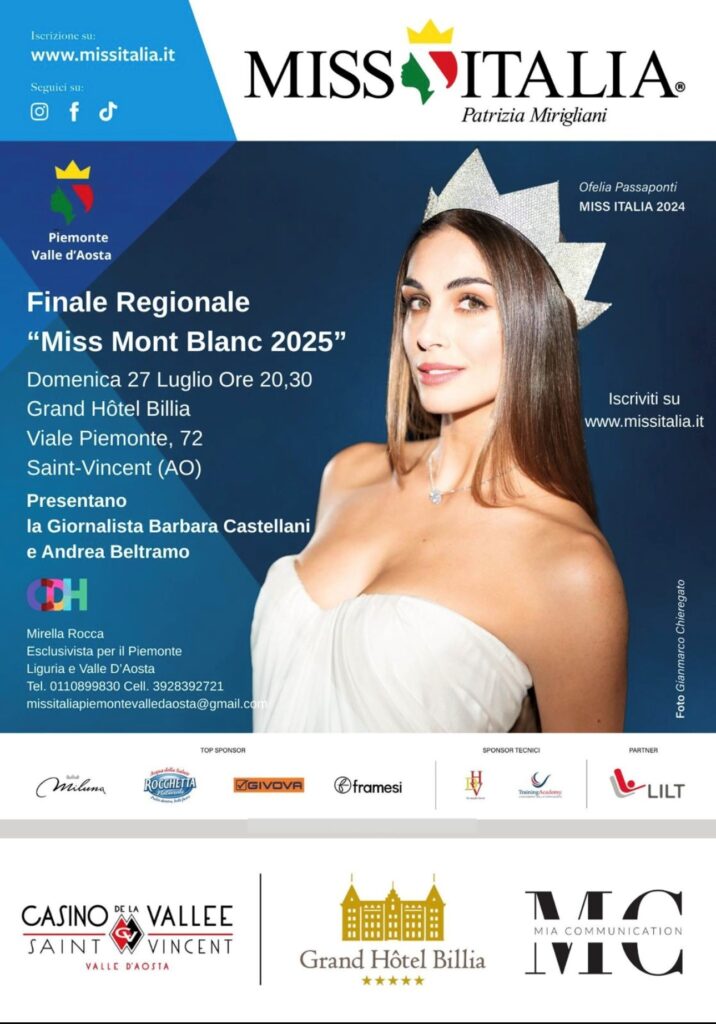 Domenica 27 luglio, alle 20:30, la prestigiosa sala Gran Paradiso ospiterà la finale regionale di Miss Mont Blanc 2025. Le finaliste sfileranno in una cornice elegante e prenderanno parte a riprese video e shooting fotografici nei principali ambienti del Grand Hôtel Billia, tra cui la storica hall e la piscina all’aperto.