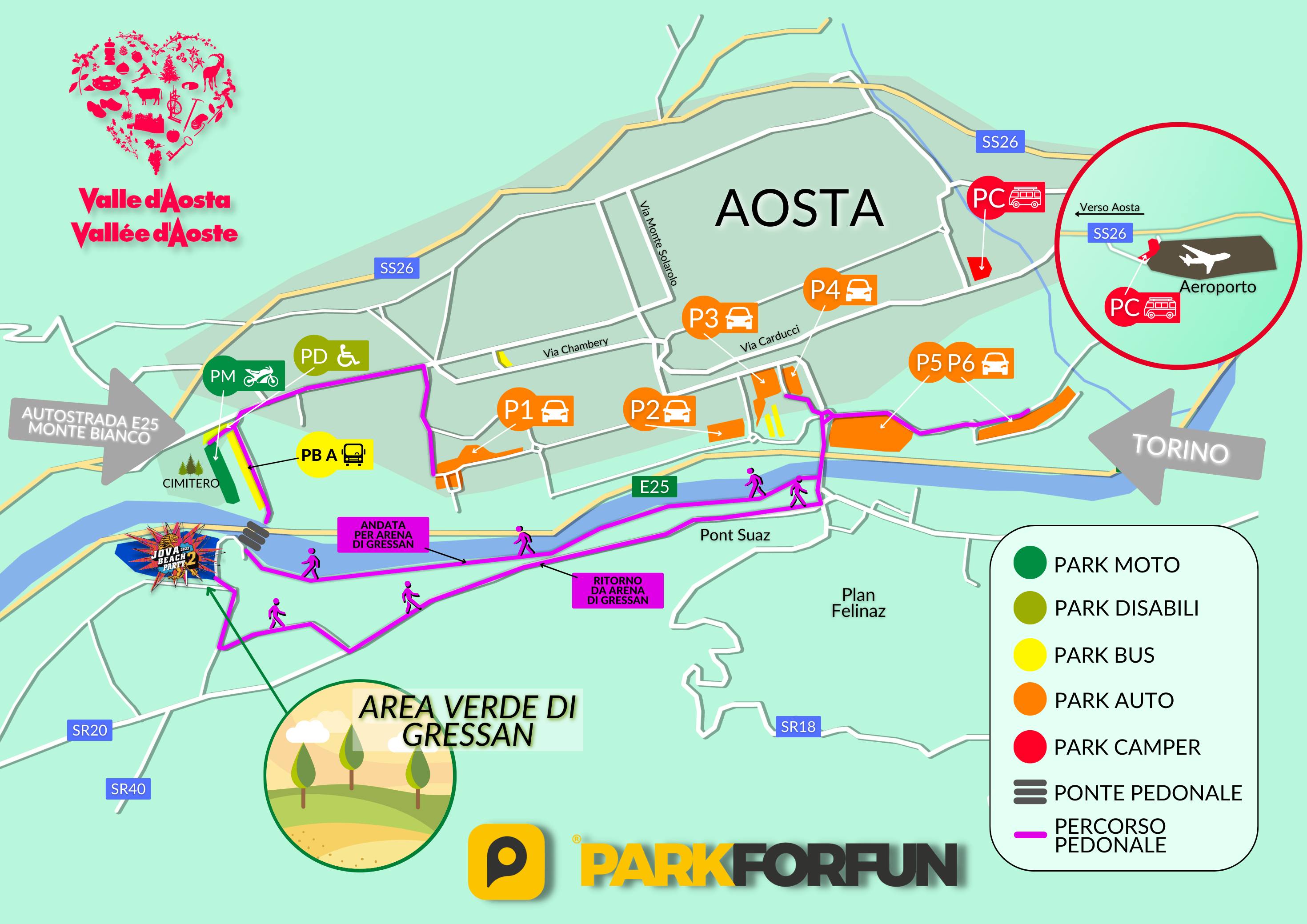 A chi utilizza l’automobile si raccomanda di prenotare il proprio posto auto gratuito nelle apposite aree parking sulla piattaforma di ParkforFun: https://www.parkforfun.com/it/events/place/aosta-gressan-area-verde.