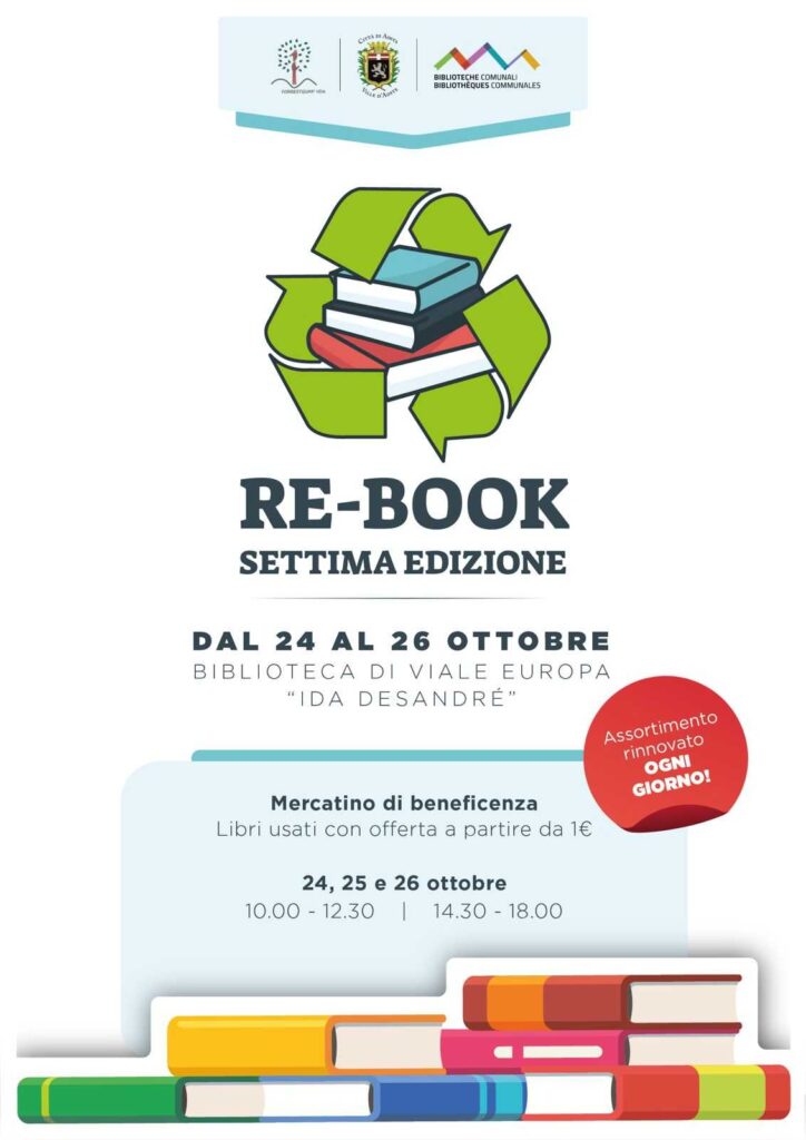 Dal 24 al 26 ottobre torna ad Aosta l’appuntamento con ‘Re-book’, il mercatino del libro usato che quest’anno celebra la sua settima edizione. L’iniziativa – promossa in collaborazione con l’associazione di promozione sociale Forrestgump Vd’A – si svolgerà come di consueto nel salone polivalente della Biblioteca comunale ‘Ida Désandré’ di viale Europa.
